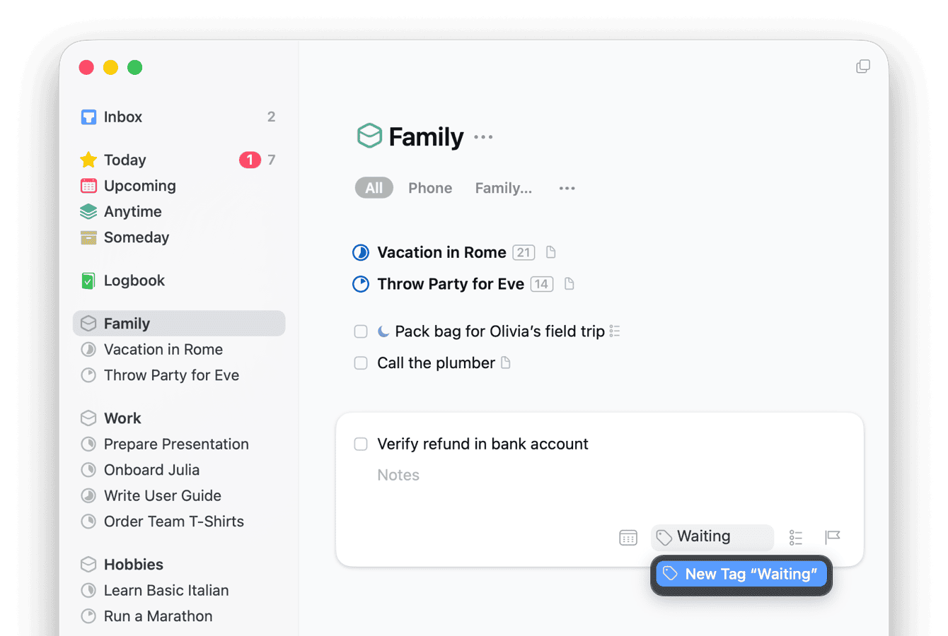 The key to managing waiting to-dos is to tag them. Then you can move them out of your daily view so they don’t create false urgency or distract you from what you can actually accomplish. The Waiting tag helps you label these to-dos initially and makes them easy to find when it’s time to review them.