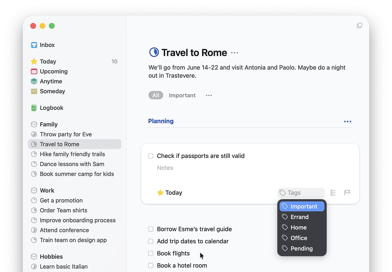 If you need more than a single priority tag, you can of course create as many as you want. But we do suggest you try working with just one for a while to see if it fits your needs. It’s a simpler workflow, and you don’t have to constantly evaluate where to-dos fall on a subjective scale of importance.